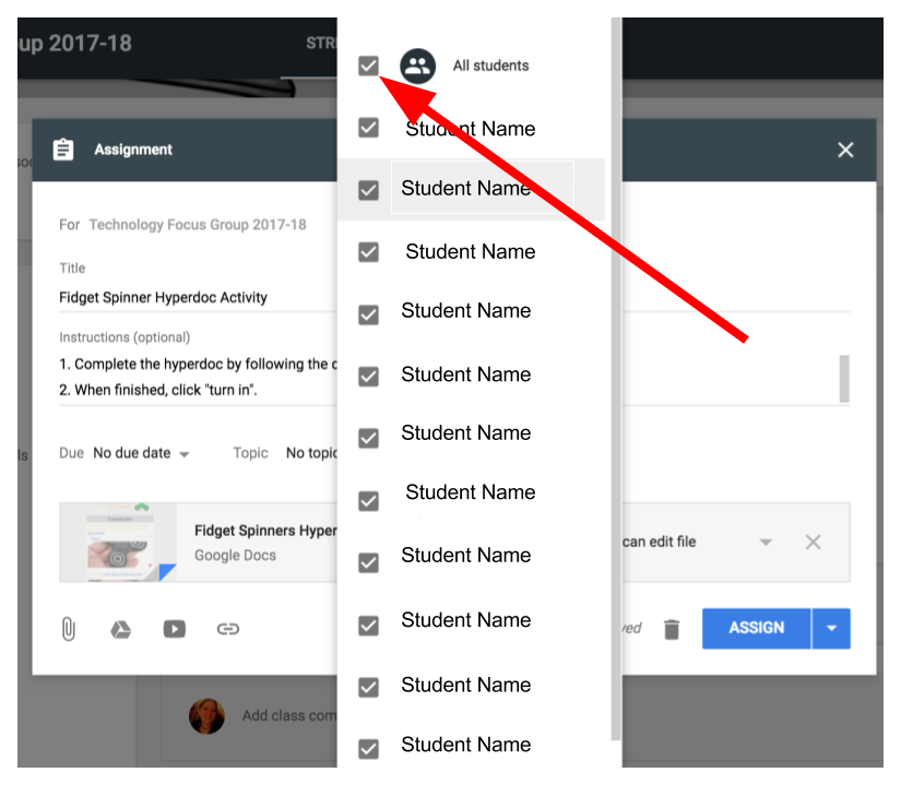 You'll see a dropdown box with the name of each student in the class. Un-click the box next to "all students".