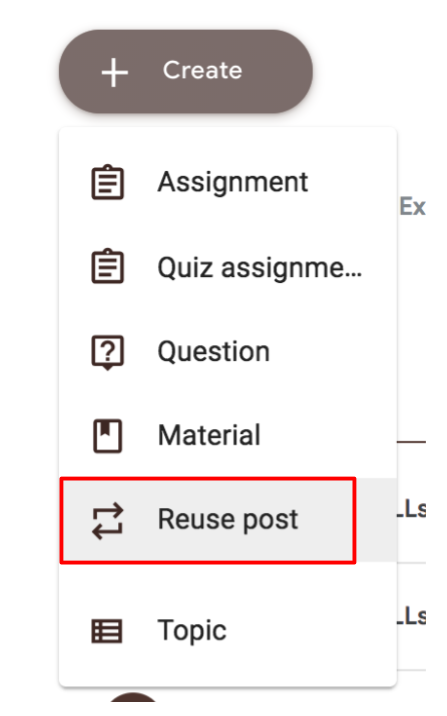 To post the assignment for group two, click the "create" button in the upper left of the Classwork Tab. Select "Reuse Assignment".